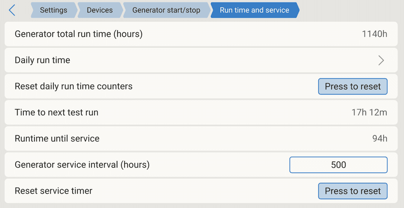 If your installation has an autostart generator that is activated by the GX device, one of the useful features of VenusOS is the ability to track the runtime hours and count down to a service interval. This is originally set up in the auto-start generator controls menu on the GX device itself.