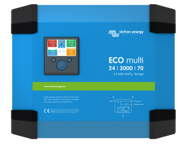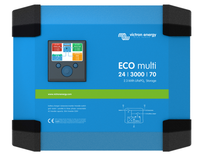 Der ECOmulti lässt sich an der Wand montieren, ist einfach zu installieren, einfach zu programmieren und einfach zu bedienen. Mit einer Lithium-Ionen Speicherkapazität von 2,3 kWh und einem 3 kVA bidirektionalen Wechselrichter verleiht der ECOmulti mehr Netzunabhängigkeit.